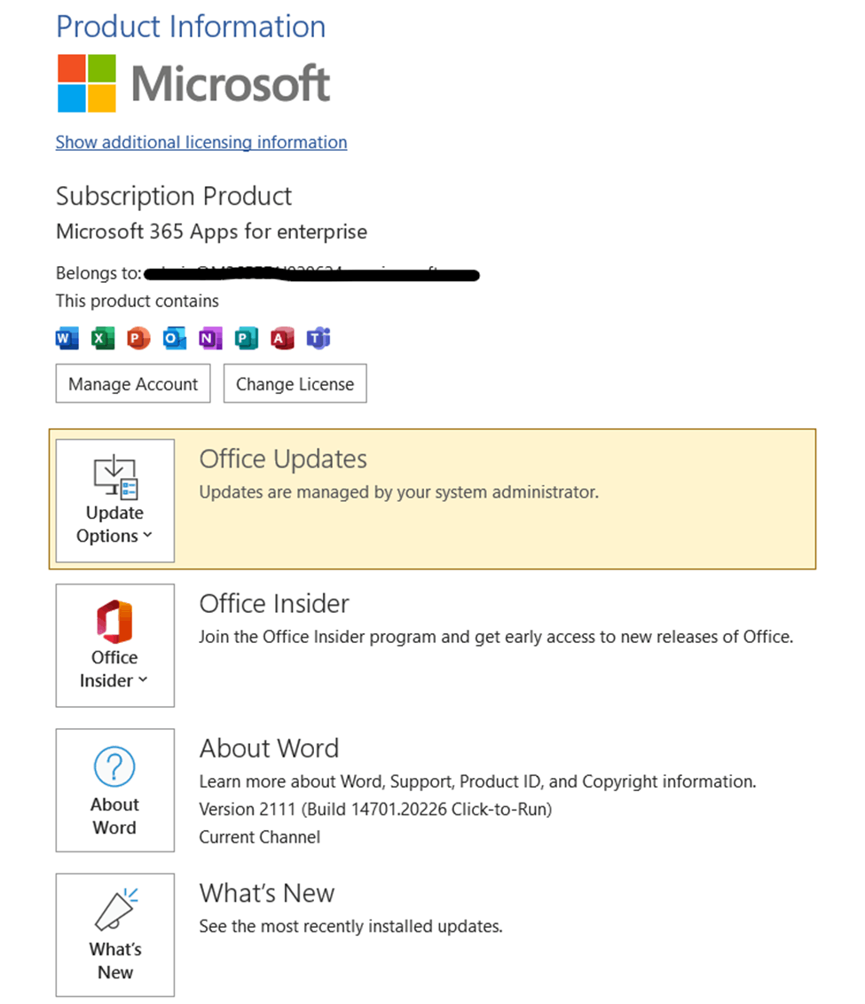 - Comparta también una captura de pantalla de su versión de Office si usa la aplicación de escritorio de Office abriendo la aplicación Word/Excel > la cuenta de > de archivos