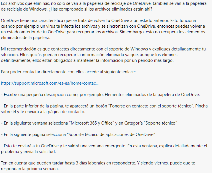 Lamento escuchar sobre el problema que está experimentando con OneDrive. Entiendo que borraste accidentalmente algunos archivos de la papelera y estás buscando recuperarlos. Solo un aviso de que, en lo que respecta a este tipo de problema, nuestra opción es limitada y solo podemos realizar pasos básicos de solución de problemas. Por favor, permítanme hacerle algunas preguntas para entender mejor su inquietud.