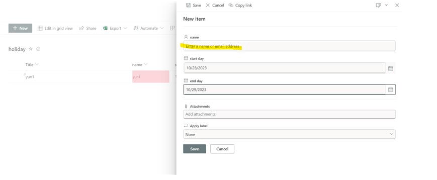 De hecho, cambiar el tipo de columna "Nombre" a "elección" es una solución alternativa, pero requiere actualizar las opciones de "elección" siempre para cualquier usuario que entre y salga.
