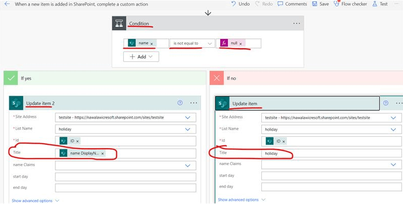 En caso afirmativo, agregue la acción "actualizar elemento", ingrese la URL del sitio, el nombre de la biblioteca y el ID del artículo, la parte "Título" elija "nombre Nombre para mostrar"