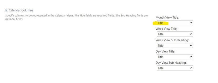 Primero, vaya a la configuración de la vista y cambie el título de visualización del calendario para que sea la columna predeterminada "Título" (texto único) en lugar de "Nombre".