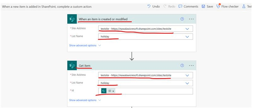 Haga clic en el siguiente paso y elija "obtener elemento", ingrese la URL del sitio y busque la lista relacionada, ingrese "ID" en el área de "contenido dinámico".