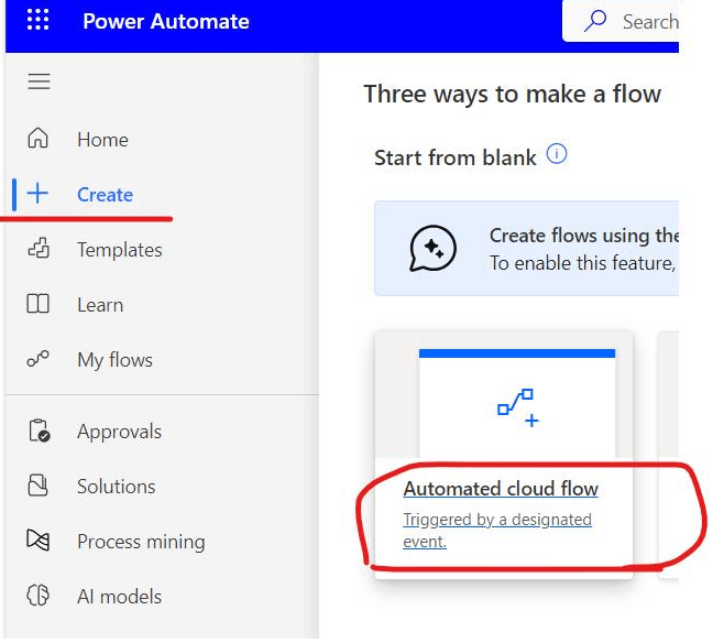 Abra la aplicación "PowerAutomate" de su lado >> cree un "flujo de nube automatizado"