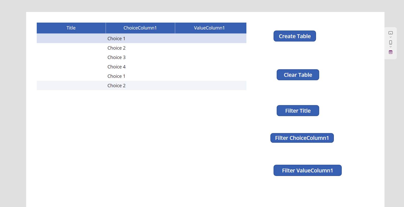 Para filtrar los datos por cada columna, puede agregar tres botones: Título del filtro, Opción de filtroColumna1 y Valor del filtroColumna1.