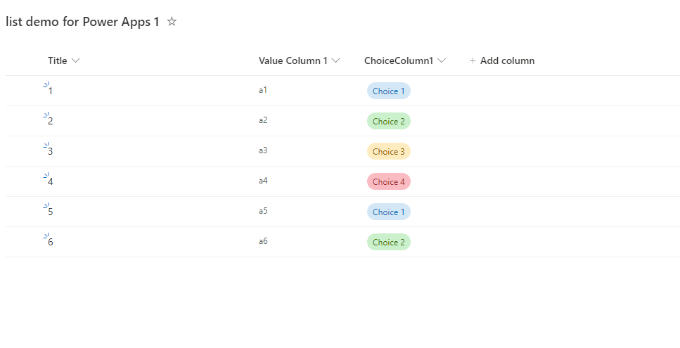 Filter ChoiceColumn1: Clear(collection1);Collect(collection1,'list demo for Power Apps 1');ClearCollect(collection1,ShowColumns(collection1,"ChoiceColumn1"))