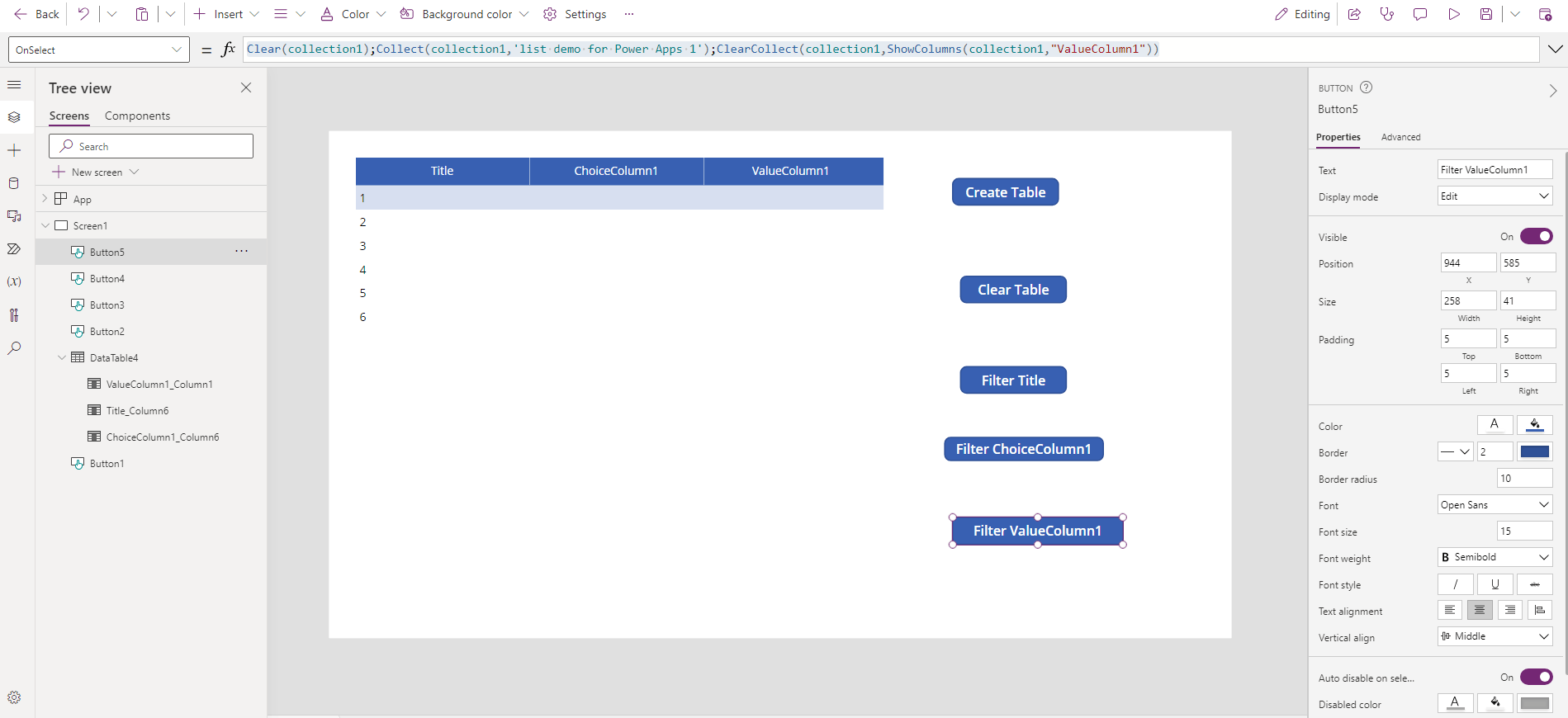 Filter ValueColumn1: Clear(collection1);Collect(collection1,'list demo for Power Apps 1');ClearCollect(collection1,ShowColumns(collection1,"ValueColumn1"))