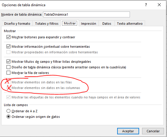 Prueba estos ajustes de las opciones de tabla dinámica y asegúrate de que no haya celdas en blanco o de texto en las columnas de valores.