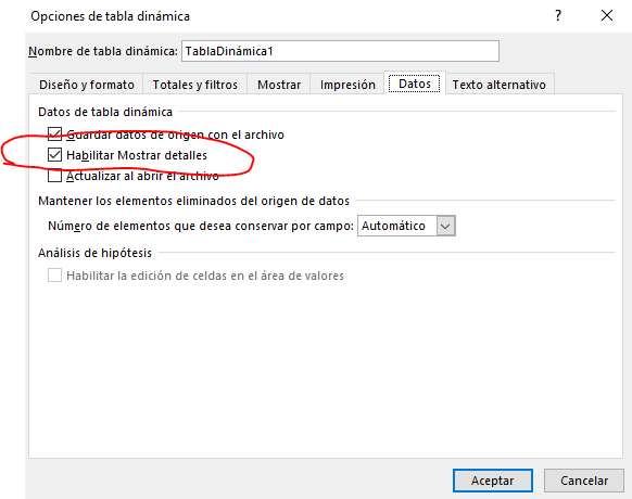 Estoy utilizando una tabla dinámica en Excel, al hacer clic en un dato, la pestaña que me genera es con toda la información, no me muestra el detalle correctamente.