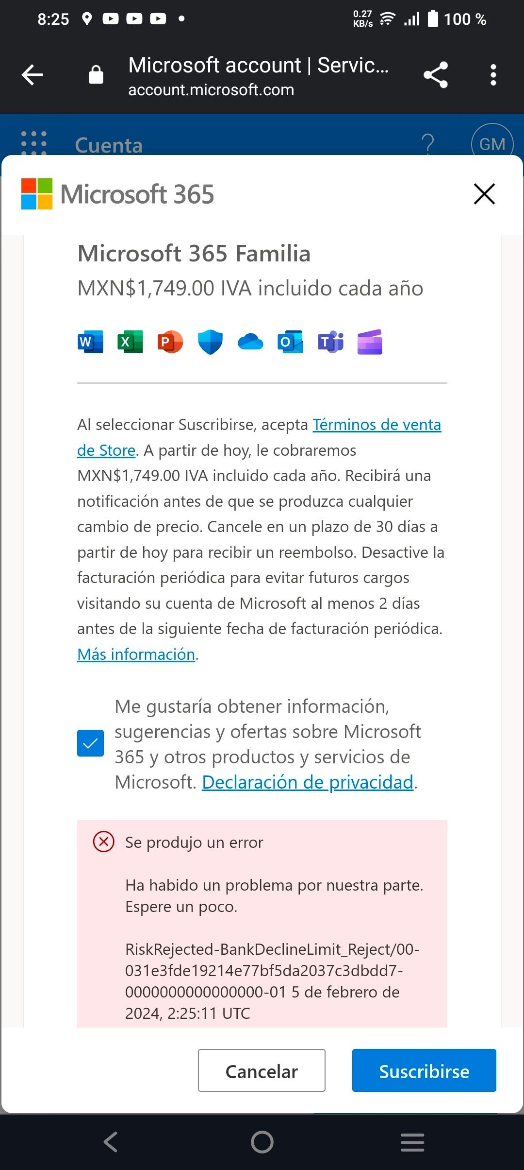 Según la descripción, no pudo pagar una suscripción a Microsoft 365. Comprendemos la urgencia de este asunto. Aquí en Community, no tenemos acceso a la herramienta para verificar la cuenta de alguien. Para asegurarte de que tu cuenta sea investigada para este cargo y solicitud de reembolso, te recomendamos que te pongas en contacto con nuestro equipo de soporte en vivo. Tienen herramientas avanzadas para verificar las inquietudes de facturación y compra. Siga los pasos a continuación: