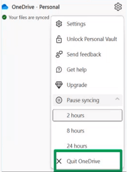 - Reinicie OneDrive: A veces, simplemente reiniciar la aplicación OneDrive puede ayudar a resolver problemas de sincronización. Haga clic con el botón derecho en el icono de OneDrive en la bandeja del sistema (Windows) o en la barra de menús (macOS), luego expanda la selección Pausar sincronización y seleccione "Salir" de OneDrive y, a continuación, vuelva a abrir OneDrive
