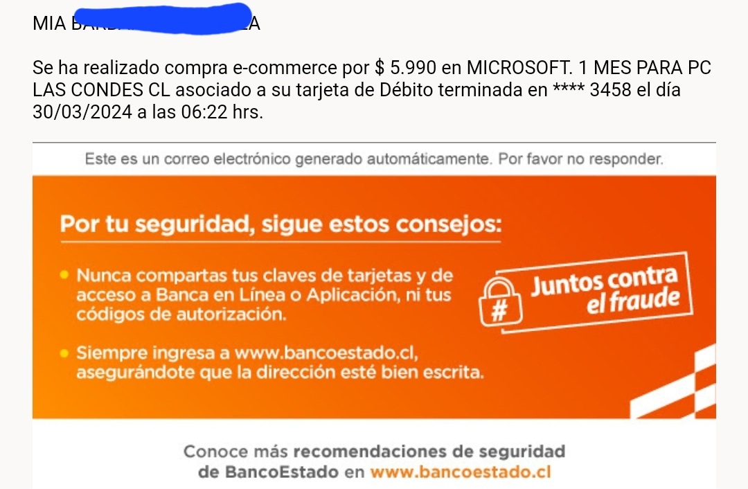Hola, quería informar que el sábado 30 de marzo a las 6:30 de la mañana se hizo una compra de 5,990 pesos chilenos y solicito un reembolso ya que no es primera ves que me hacen este tipo de compras cuando ni si quiera tengo xbox o Microsoft, y porfavor pido un reembolso. Cómo ven ahí tengo mis pruebas y porfavor les pido un reembolso de todo lo que me han quitado. Y también pido rembolso de otra compra que se hizo sin mi autorización del mismo valor el 5 de febrero de 2024.