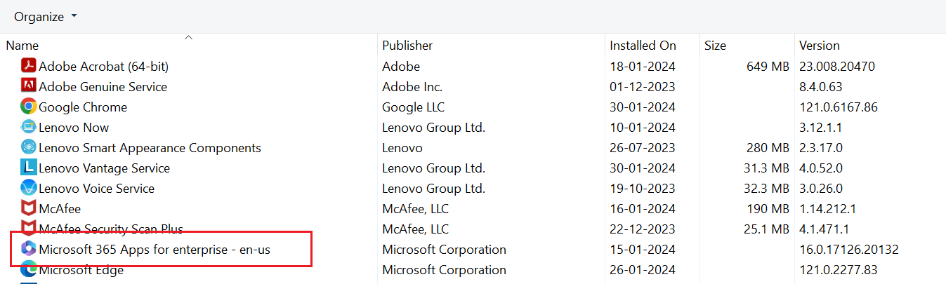 Abra el Panel de control> Programas> Programas y características> Vea si tiene las aplicaciones de Office enumeradas como se muestra a continuación: