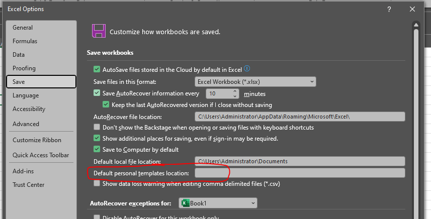 Archivo >Opción>Guardar>Ubicación predeterminada de las plantillas personales.