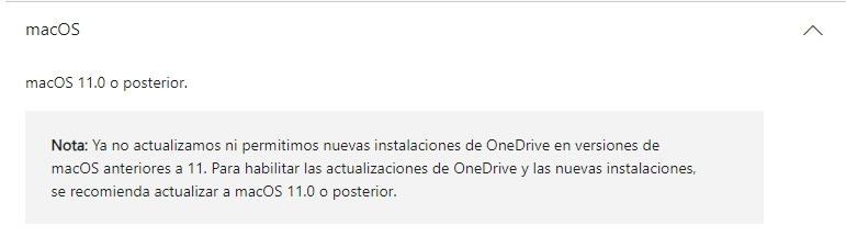 Tenemos que explicarte que OneDrive tiene un requisito mínimo de 11.0 para MacOS y Microsoft ya no actualiza ni permite que OneDrive se instale en versiones anteriores a la 11.0.