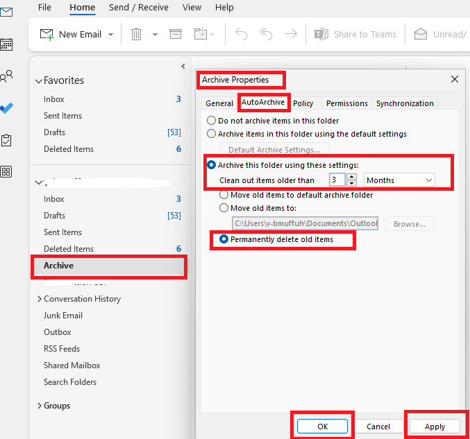 Si desea una directiva específica para la carpeta de archivo, puede habilitar el archivo automático en la carpeta de archivo para eliminar permanentemente los correos electrónicos de 1 a 4 años.