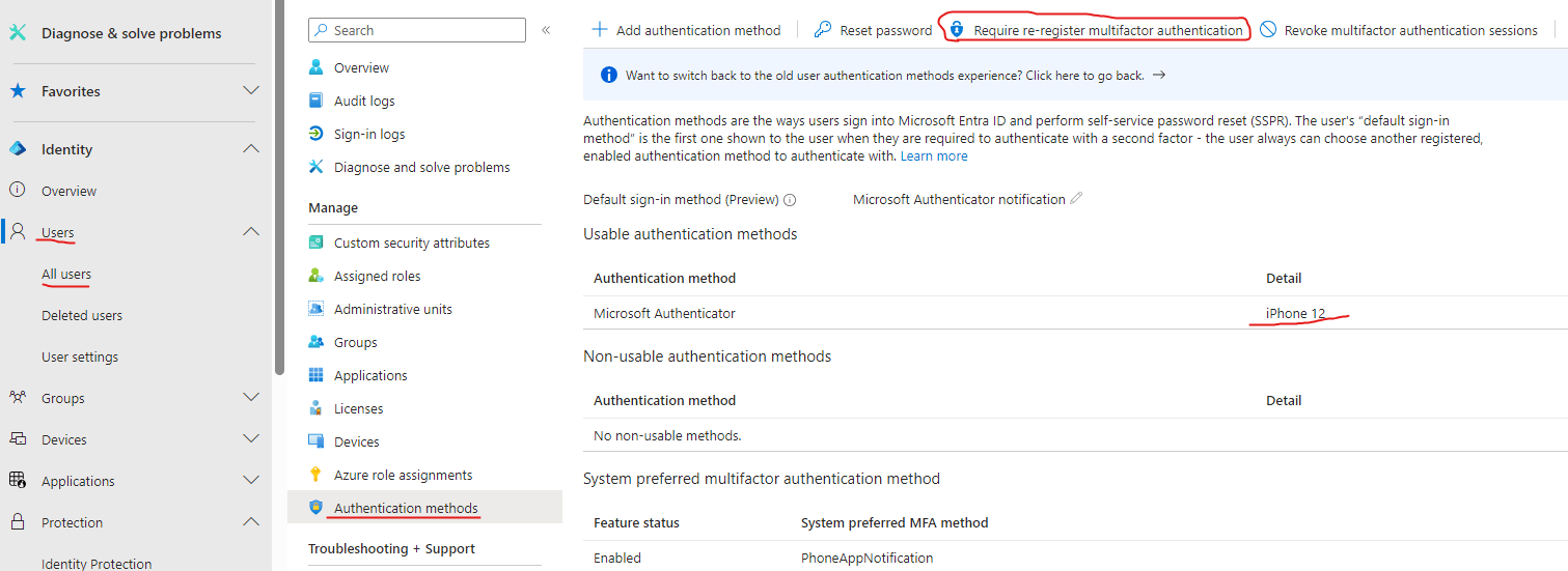Si tiene una cuenta de administrador alternativa y aún puede acceder a la página de administración, puede iniciar sesión en el identificador de Microsoft Entra ( https://entra.microsoft.com/) -->Usuarios -->Todos los usuarios -->Seleccione su cuenta en cuestión -->Método de autenticación -->seleccione Volver a registrar la autenticación multifactor -->confirme el cuadro de diálogo -->Guardar. Una vez que la sesión de autenticación multifactor se vuelva a registrar en el Centro de administración de Microsoft , generará un nuevo código QR para la autenticación y, a continuación , podrá escanear y agregar la cuenta de nuevo a la aplicación de autenticación o actualizar la sesión. Puede consultar Administración de métodos de autenticación para Microsoft Entra autenticación multifactor - Microsoft Entra ID | Microsoft Learn