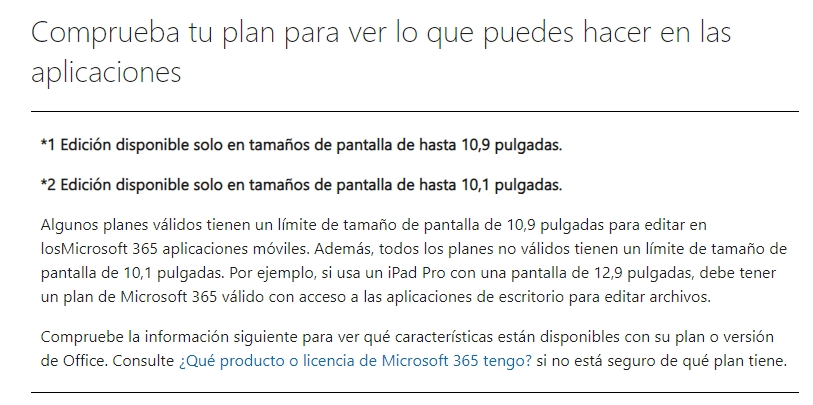 Puede consultar este vínculo para obtener más información sobre las limitaciones del software de Office para el tamaño de la pantalla: Qué puede hacer con las aplicaciones de Microsoft 365 en dispositivos móviles con una suscripción a Microsoft 365 - Soporte técnico de MicrosoftSi el tamaño de la pantalla de su iPad excede el tamaño mencionado en la imagen anterior, deberá pagar Microsoft 365 para continuar usando el software de Office en su dispositivo.O, si aún desea usar las funciones de Office en su iPad de forma gratuita, le sugiero que use la versión web de Office en su navegador como alternativa.