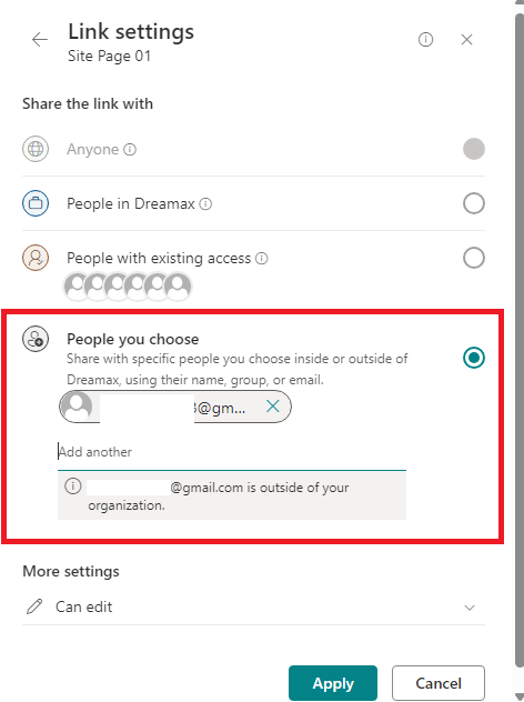 Sí, puede compartir la página a través del enlace de la persona específica>escriba la cuenta de usuario, como la cuenta de Gmail>copie el enlace>envíe el enlace al usuario y este debe acceder a la página con el código de verificación.