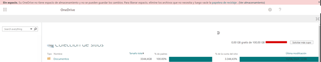 De la información "Su OneDrive no tiene espacio de almacenamiento y no puede guardar los cambios para liberar espacio, eliminar archivos que no necesita y, a continuación, vaciar la papelera de reciclaje. (Ver almacenamiento)", el almacenamiento de OneDrive para la Empresa se ha cambiado en función de las actualizaciones de almacenamiento de la suscripción educativa de Microsoft 365.