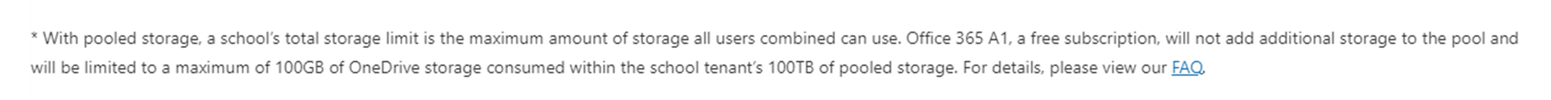Además, a partir del 1 de febrero de 2024, los usuarios de Office 365 A1 (suscripción gratuita) estarán limitados a un máximo de 100 GB de almacenamiento de OneDrive por usuario dentro de los 100 TB de almacenamiento agrupado del inquilino de la escuela.