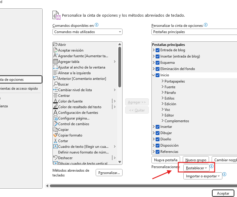 Si faltan comandos, puede intentar restablecer la cinta de opciones yendo a Opciones de > de archivo > Personalizar cinta de opciones.