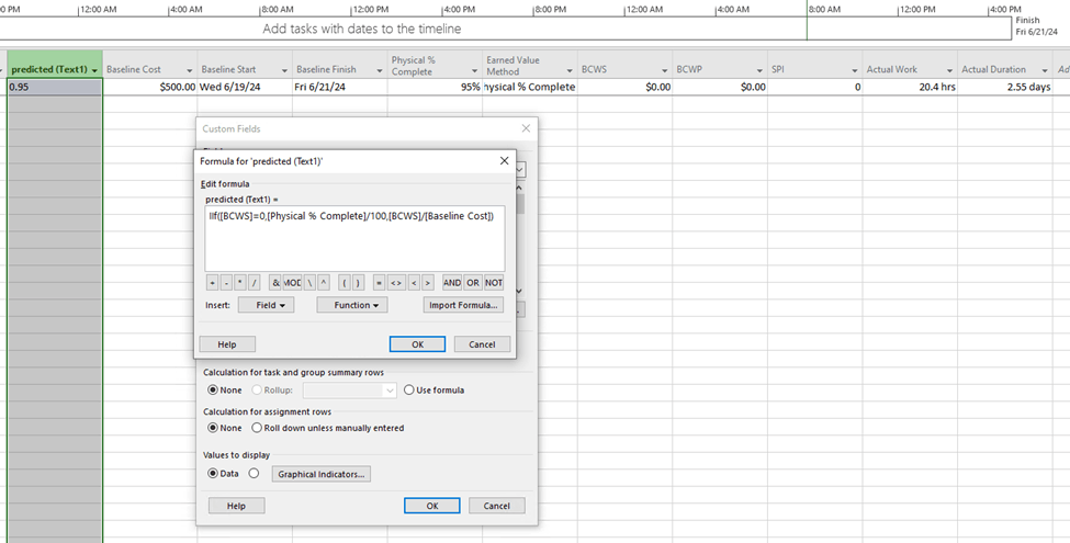 Parece que hay algunos problemas en su entorno. En función de la fórmula que mostró, si BCSW=0, el valor de la columna calculada personalizada debe ser el mismo que el valor de % físico completado.