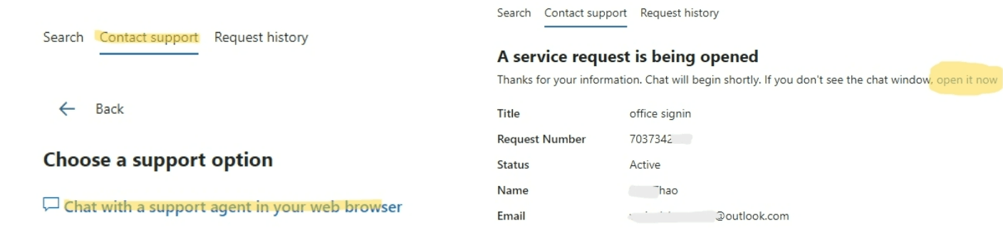Si no le resulta conveniente ponerse en contacto con el administrador para abrir el ticket, puede ponerse en contacto directamente con el equipo de soporte en línea para obtener el soporte remoto. Haga clic en: Póngase en contacto con nosotros - Soporte técnico de Microsoft.