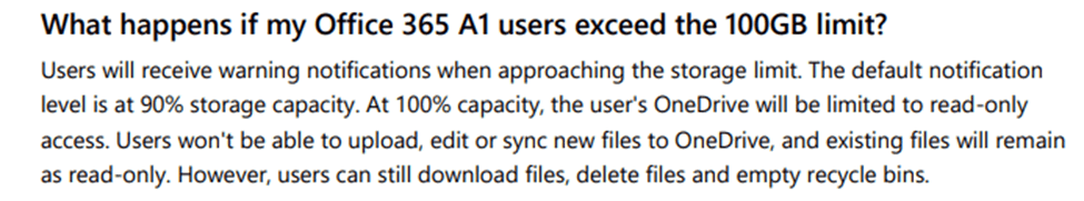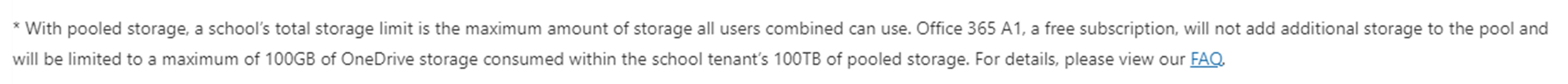 A partir del siguiente artículo, a partir del 1 de febrero de 2024, los usuarios de Office 365 A1 (suscripción gratuita) estarán limitados a un máximo de 100 GB de almacenamiento de OneDrive por usuario dentro de los 100 TB de almacenamiento agrupado del inquilino de la escuela.