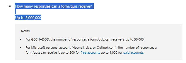 5.000.000. Consulte el siguiente documento para conocer las restricciones detalladas: Límites de formularios, preguntas, respuestas y caracteres en Microsoft Forms - Soporte técnico de Microsoft
