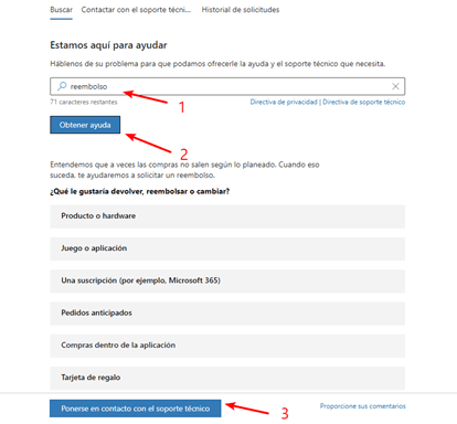 Entiendo su necesidad de un reembolso. Sin embargo, debido a los problemas de privacidad que rodean las cuentas, las suscripciones y otros problemas que involucran la información personal de los usuarios, no es apropiado divulgar dichos problemas en Microsoft Community, y no estamos en condiciones de procesar reembolsos o realizar cambios en su cuenta. Con respecto a estos problemas relacionados con los reembolsos, se requiere un departamento de facturación especializado para que los maneje por usted, y puede contactarlo a través de dos canales: Soporte de Microsoft Chat o Soporte telefónico, y en cuanto a contactar con el Soporte de Microsoft, se hace en otra ventana, donde está disponible un soporte técnico más especializado para ayudarlo a resolver sus problemas de reembolso.