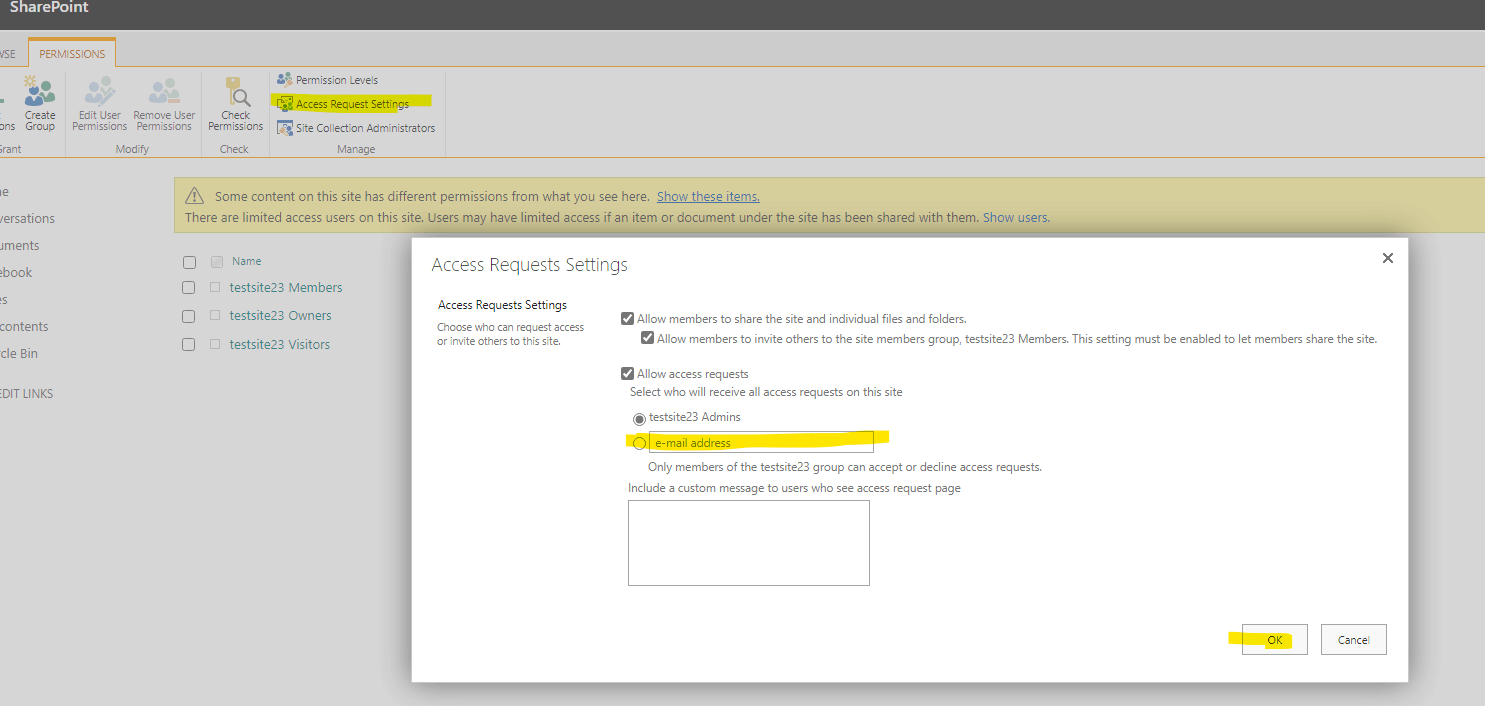Además, vaya a Permisos de SharePoint>Configuración de permisos avanzados>Configuración de solicitud de acceso>escriba su dirección de correo electrónico y, a continuación, permita que el usuario envíe una solicitud de acceso para comprobar si puede aprobar.
