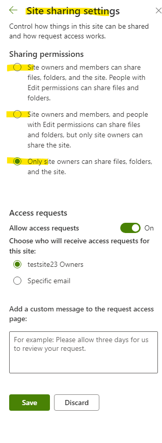 Además, compruebe la configuración> Permiso del sitio> en Cambiar cómo los miembros pueden compartir y confirme qué configuración está seleccionada.