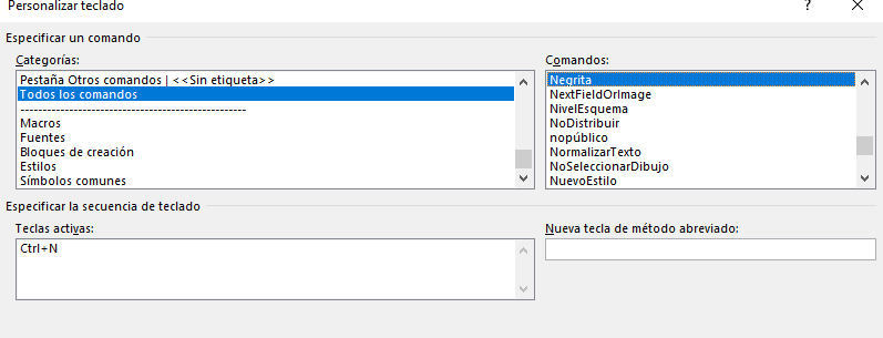4- Selecciona negrita y abajo dice Nueva tecla de método abreviado ahi presiona CTRL + N y ya queda corregido.