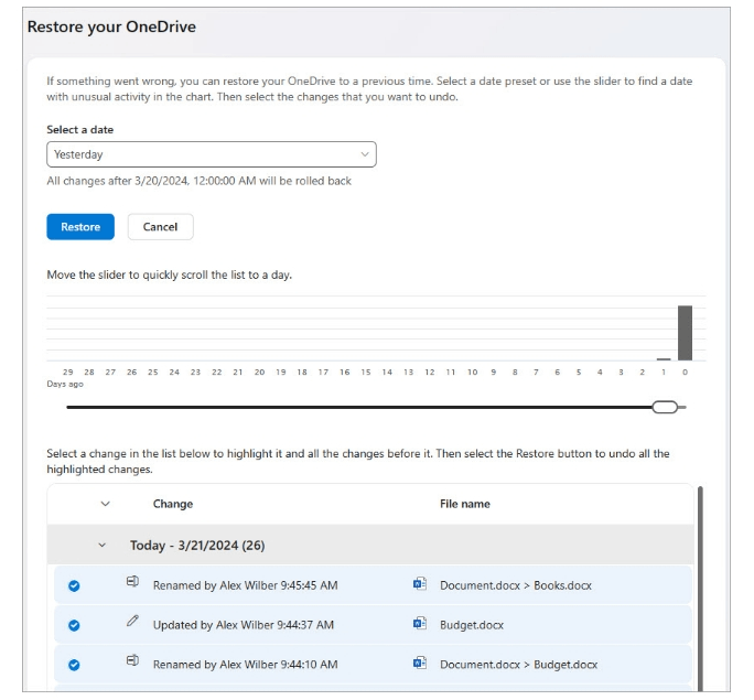 - Si encuentra documentos vacíos o incorrectos o carpetas en línea, debe usar la característica de historial de versiones de OneDrive para restaurarlos a un estado anterior. Para obtener instrucciones, consulte los siguientes temas: Restaurar una versión anterior de un archivo almacenado en OneDrive - Soporte técnico de Microsoft