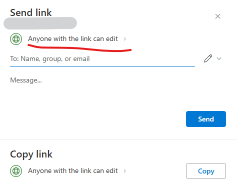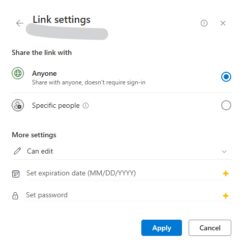 Aquí puede establecer la opción para compartir el archivo con personas específicas, establecer permisos editables y visibles para ellos y, si tiene una suscripción a Microsoft 365, puede establecer una contraseña de acceso y una fecha de vencimiento de uso compartido para la carpeta compartida.