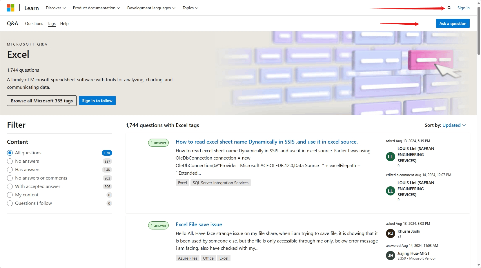 Desearía poder manejar su problema, sin embargo, es más adecuado para publicar en Microsoft Learn, más usuarios publican estos problemas allí, puede hacer clic en "Hacer una pregunta", hay expertos que pueden brindar soluciones más profesionales en ese lugar. Aquí hay un enlace (English Only) al foro donde puede plantear escenarios específicos y compartir su idea para ayudar a resolver el problema. Si te resulta difícil leer los foros en inglés, también puedes ir a los foros en español haciendo clic en el enlace: Etiquetas - Microsoft Q&A (por el momento no hay tantos recursos en idiomas pequeños como en inglés, por lo que te recomendamos que utilices los foros en inglés).