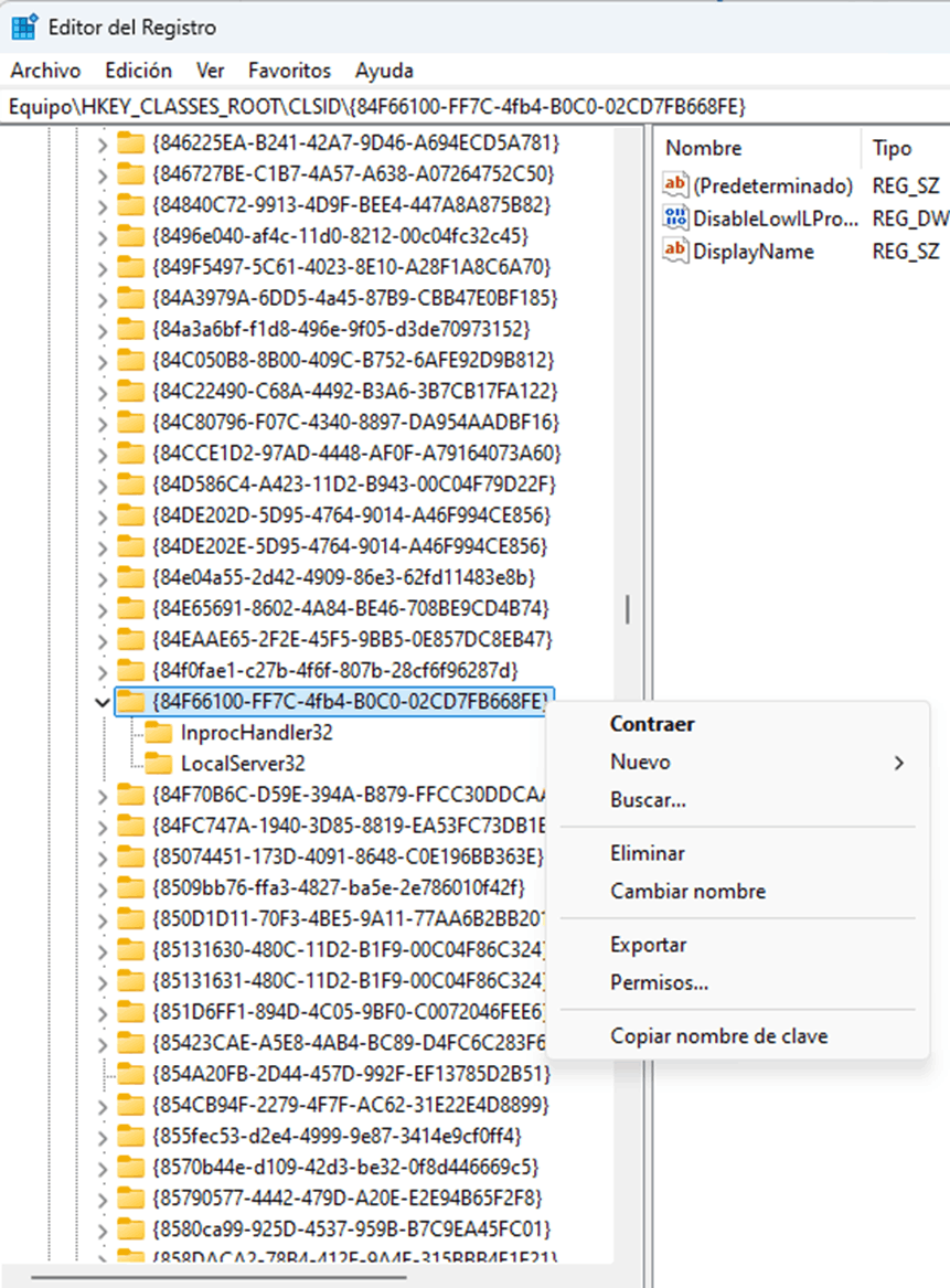 HKCR\CLSID\{84F66100-FF7C-4fb4-B0C0-02CD7FB668FE} HKCR\CLSID\{65235197-874B-4A07-BDC5-E65EA825B718} HKCR\CLSID\{00020827-0000-0000-C000-000000000046} - Cierre el Editor del Registro y reinicie la computadora. A continuación, vea el efecto.