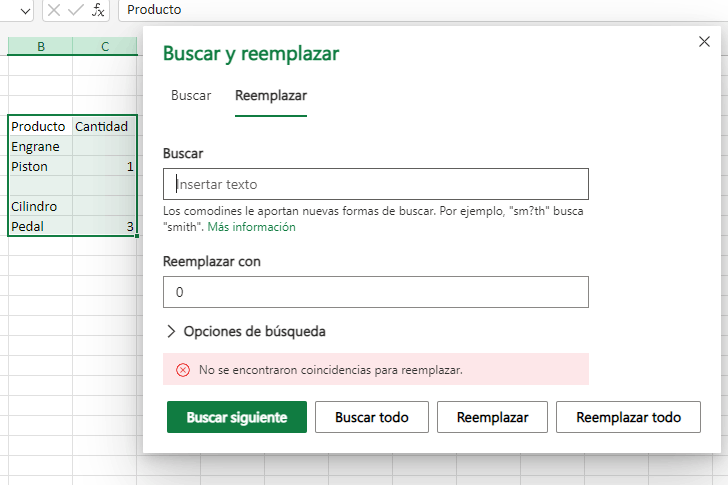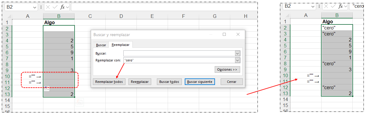 Cuando se quiere reemplazar las celdas vacías por 0 me marca que no encuentra coincidencias, en el campo Buscar lo dejo Vacío y en el Reemplazar con le pongo el valor de 0. Quisiera saber que tengo que poner en el campo buscar para que en las celdas vacías las reemplace por un cero