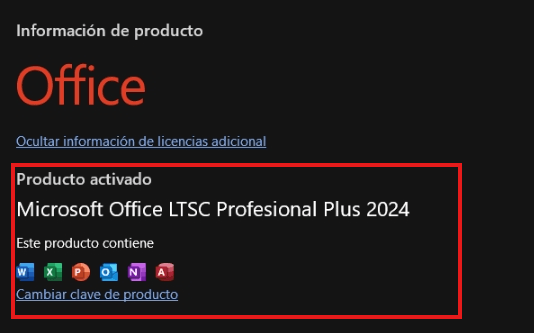 Según la captura de pantalla, en "Producto activado", se muestra Office LTSC Professional Plus 2024.