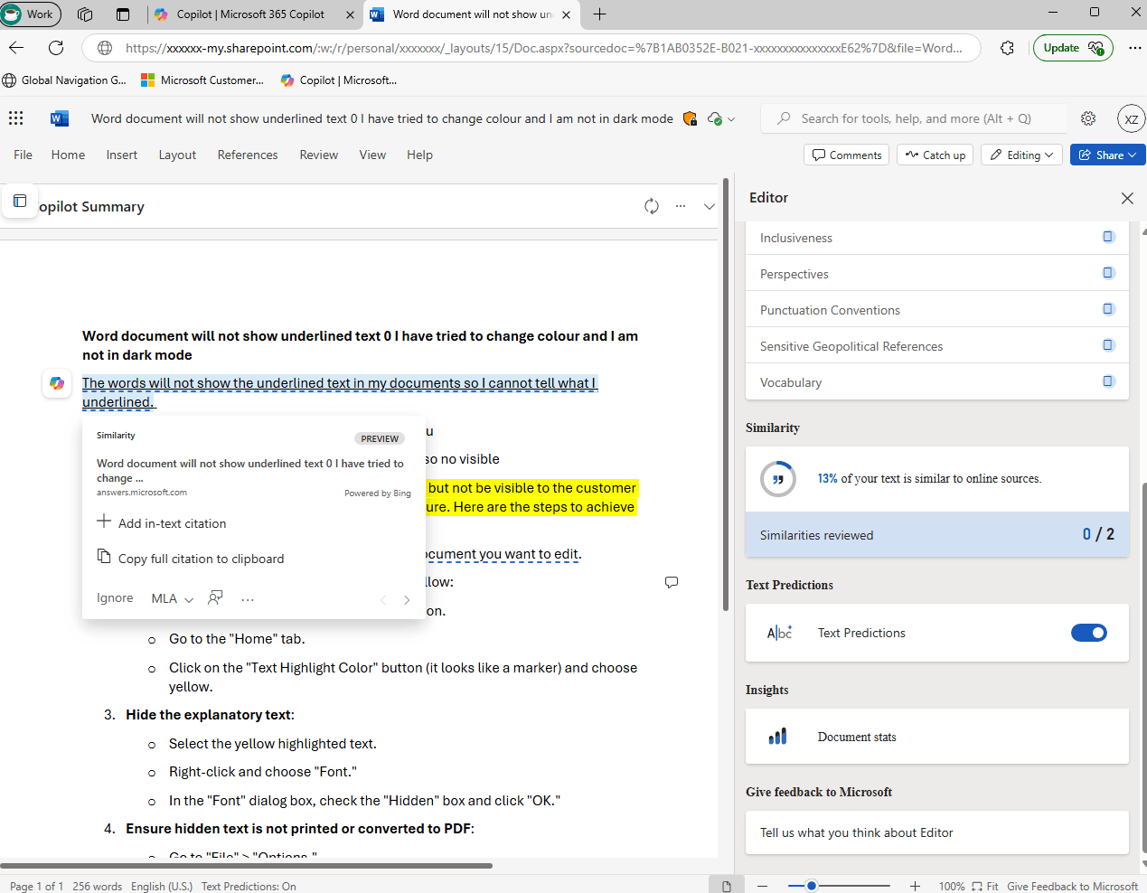 Si mi comprensión es correcta, para asegurarme de que puedo tener la comprensión general del escenario y asegurarme de proporcionar las sugerencias correctas, ¿podría compartir el mensaje de error completo del error que recibí de su parte cuando lo hago desde word.office.com desde diferentes navegadores locales? Mientras tanto, verifique si aparecerá el mismo problema en todos los documentos, como archivos nuevos y existentes.