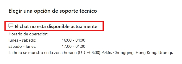 Consejo: El equipo de soporte por chat tiene un horario de trabajo limitado, por lo que si ves la última ventana que indica que no se pueden contactar contigo, te recomendamos que lo intentes de nuevo al día siguiente. Si prefiere soporte telefónico, puede dejar su número de teléfono. De esta manera, pueden comunicarse con usted y ayudarlo con su problema.
