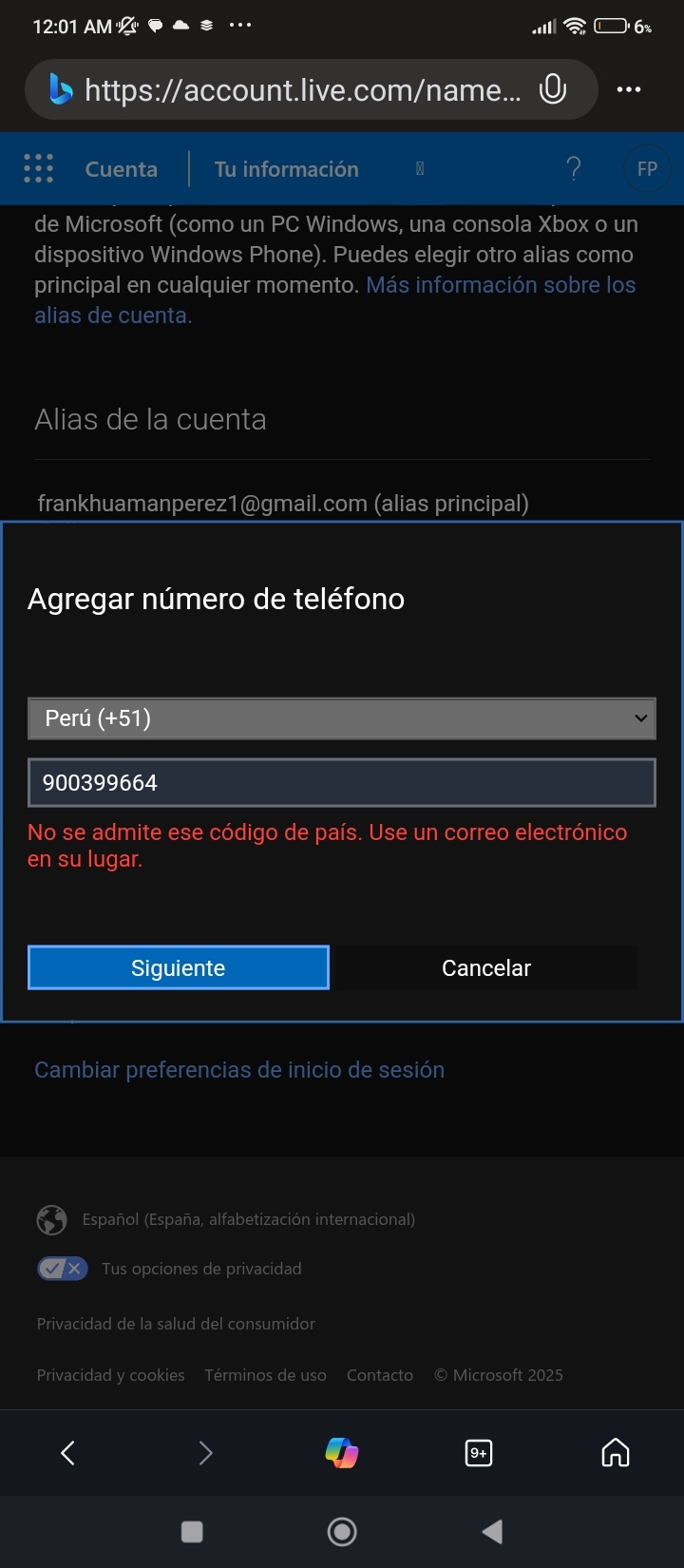 E estado intentando varias veces agregar mi número dé teléfono a mi cuenta de Microsoft pero no me quiere dejar y e intentado de todo incluso crearme una cuenta nueva