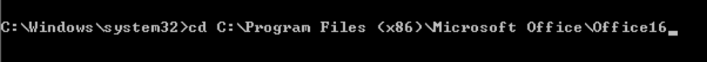 - Presione la tecla de Windows + S, busque "cmd" en el cuadro de búsqueda, busque "Símbolo del sistema" en los resultados de búsqueda, botón derecho del mouse y seleccione "Ejecutar como administrador".2.Ingrese el cd C: \ Archivos de programa (x86) \ Microsoft Office \ Office16Si se le solicita una ruta incorrecta, escriba cd C:\Archivos de programa\Microsoft Office\Office16