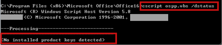 .5. Compruebe si la desinstalación parece haberse realizado correctamente. Vuelva a introducir el siguiente comando para verificar si hay otras teclas y repita los pasos anteriores si las hay. Se han desinstalado todas las claves y se mostrará la siguiente imagen. cscript ospp.vbs /dstatus