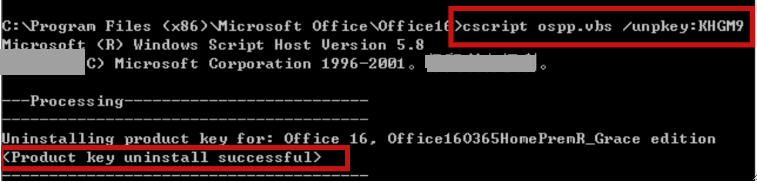 .4.Ingrese el siguiente comando para descargar los últimos cinco bits de la clave: cscript ospp.vbs /unpkey:(se muestran los últimos cinco dígitos de la clave)[Por ejemplo:cscript ospp.vbs / unpkey:KHGM9]
