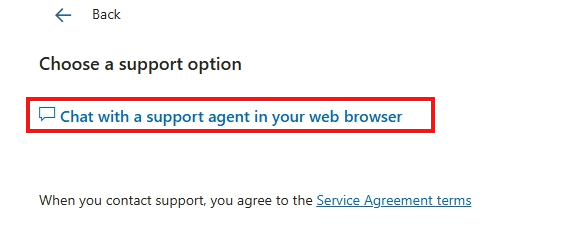 - Confirme su problema y elija Chatear con un agente de soporte.