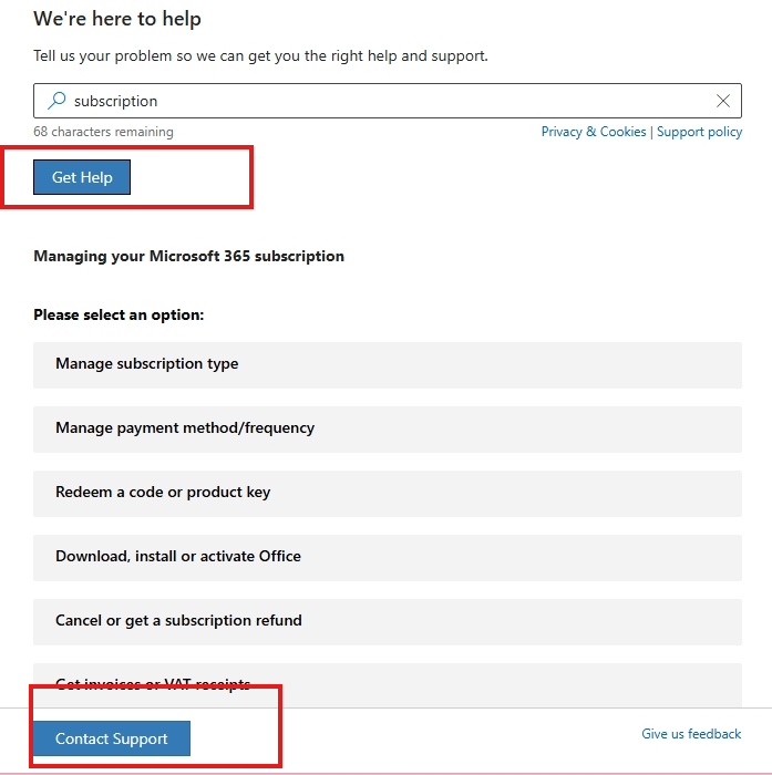 - Haga clic en Obtener ayuda y, a continuación, seleccione Contactar con el servicio de asistencia.
