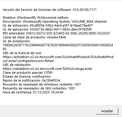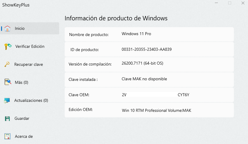 Por favor, proporciona una captura de pantalla de la ventana de la aplicación y oculta tu clave de producto en ella.