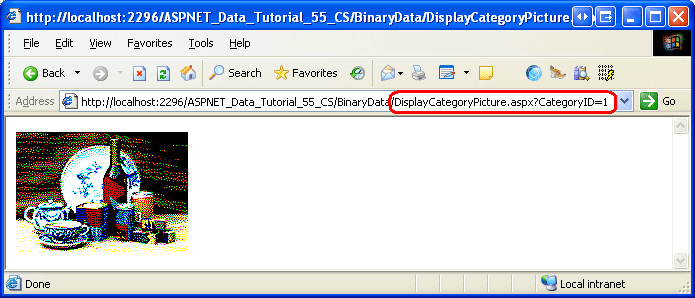 Ahora que tiene una página web para mostrar una imagen de categoría determinada, la puede mostrar mediante el control web Image un elemento <img> HTML que apunte a DisplayCategoryPicture.aspx?CategoryID=categoryID. Las imágenes cuya dirección URL viene determinada por los datos de la base de datos se pueden mostrar en controles GridView o DetailsView mediante ImageField. ImageField contiene propiedades DataImageUrlField y DataImageUrlFormatString que funcionan como las propiedades DataNavigateUrlFields y DataNavigateUrlFormatString de HyperLinkField.