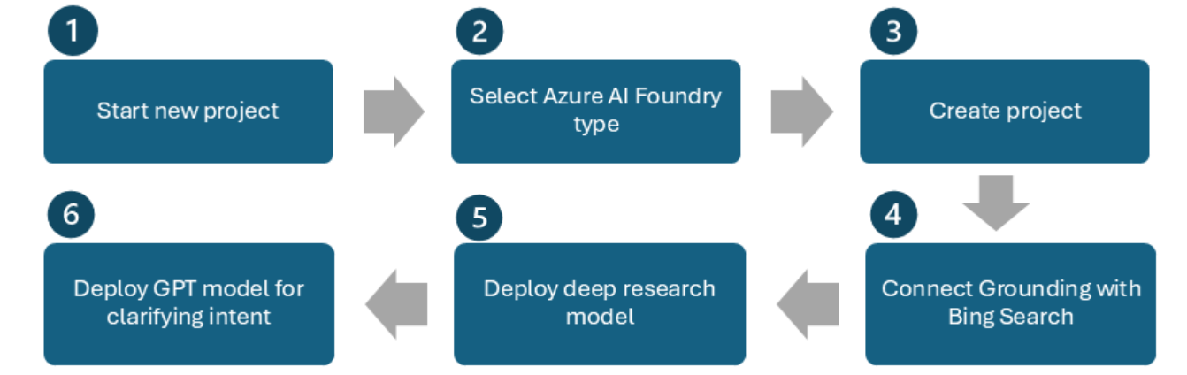 Para usar la herramienta Deep Research, debe crear un proyecto del tipo Foundry, agregar su recurso Grounding con el recurso Bing Search como una nueva conexión, implementar el o3-deep-research-model y desplegar el modelo GPT de Azure OpenAI seleccionado.